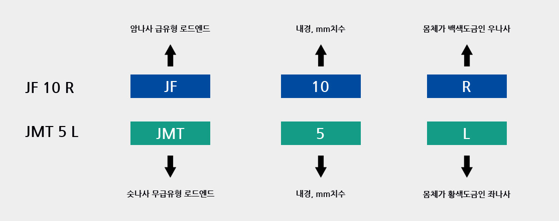 일반적으로 JMC에서 생산하는 로드 엔드는 구면내륜, 즉 볼과 숫나사 혹은 암나사, 우나사 혹은 좌나사 등의 축수를 가지는 하우징(몸체라고도 함), 그리고 부시(부싱이라고도 부름)로 구성되어 있습니다.