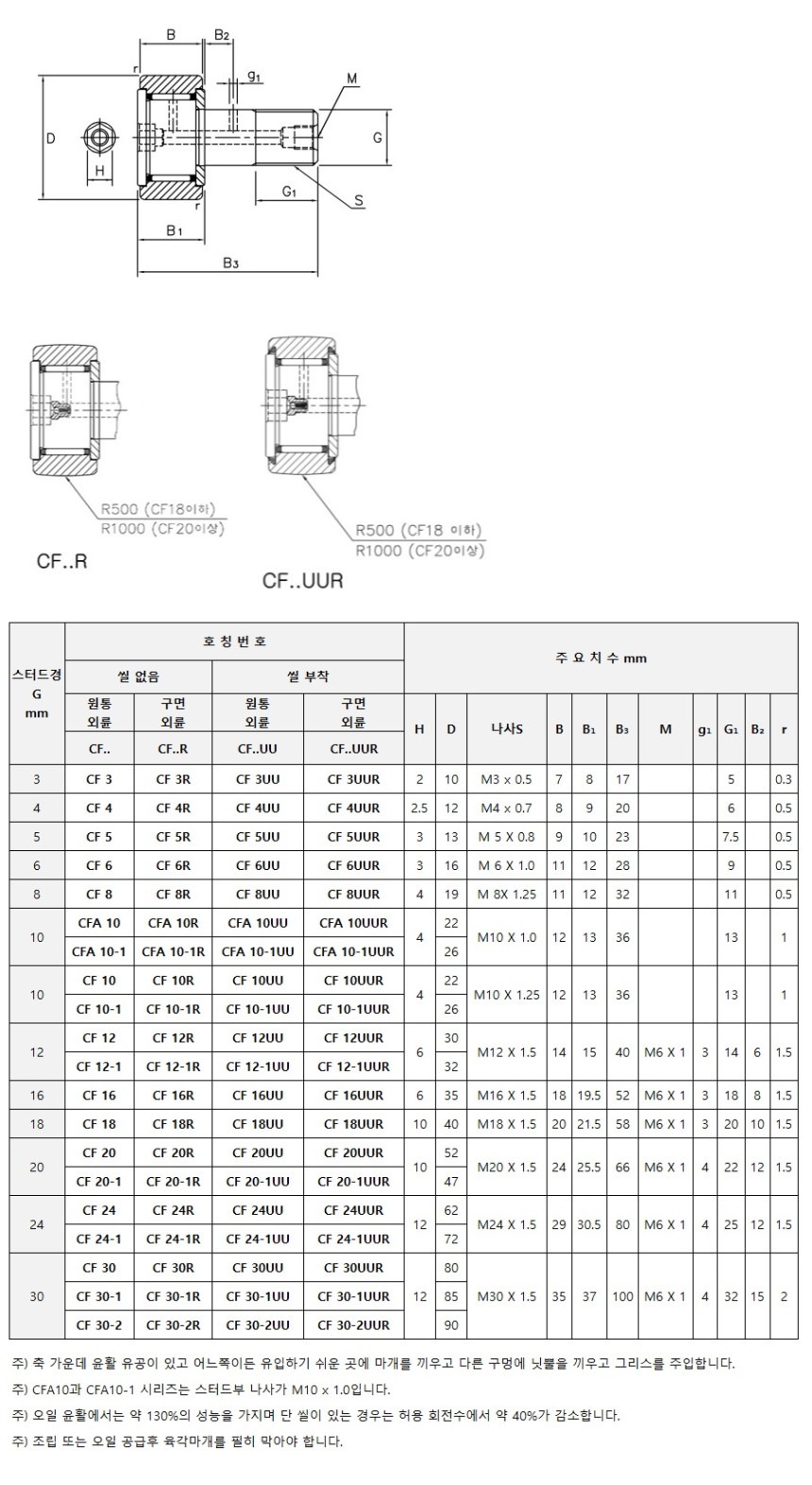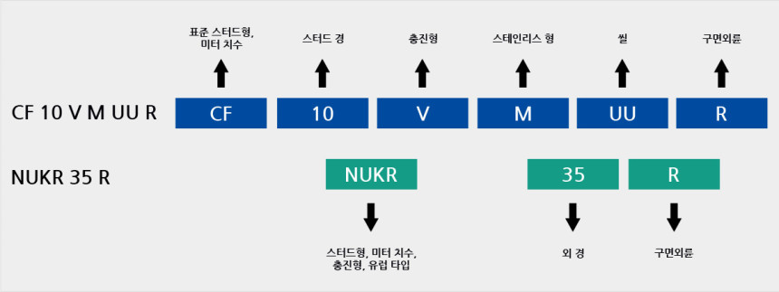 케이지 형은 샤프트와 롤러 사이에 니들을 분할하고 니들 사이에 그리스가 작용하서 니들의 구름을 원활하게 해주며 고속 및 중하중에 적합합니다. 반면, 케이지가 없이 니들만으로 꽉 찬 충진형은 저속 회전 및 고하중을 받으며 주기적으로 재급유를 해야 하는 비분리형 베어링입니다. JMC 스터드 형 트랙 로울러 스터드 머리부에는 육각 렌치 소켓이 있어서 이 급유구를 통해 니들에 그리스를 급유할 수 있으며 또한 CF 12 이상은 스터드 나사부로도 급유가 가능합니다.
