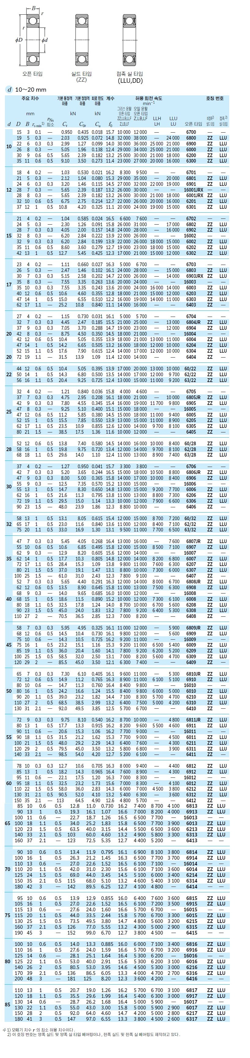 | 형식 및 기호 | ZZ(쉴드,철커버) | LLB(비접촉시일,고무커버) | LLU(접촉시일,고무커버) |