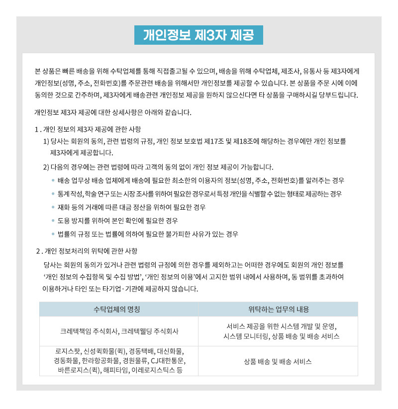 2. 지정된 택배사가 아닌 다른 택배사를 이용하실 경우 배송료 전액을 고객님께서 부담하셔야 합니다.
