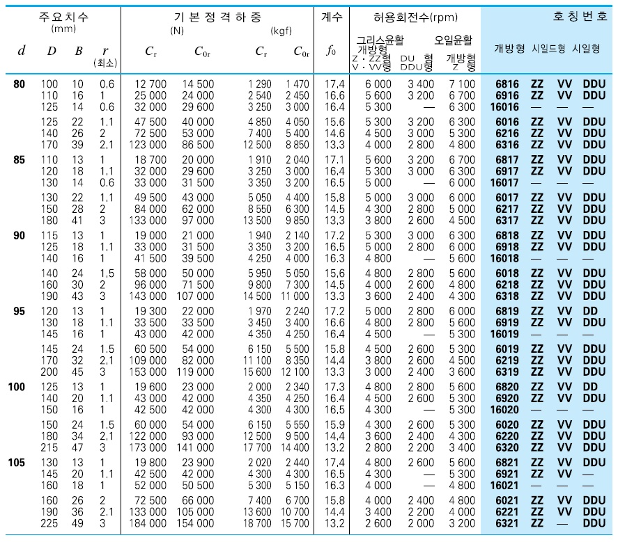 | 형식 및 기호 | ZZ(쉴드,철커버) | UU(비접촉시일,고무커버) | DD(접촉시일,고무커버) |