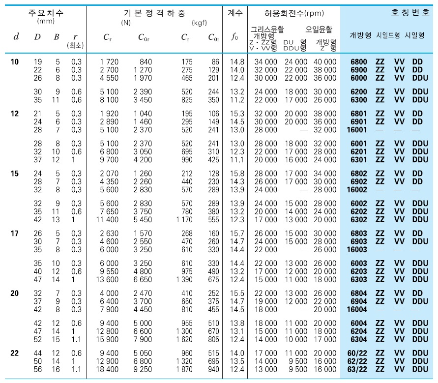 형식 및 기호 | ZZ(쉴드,철커버) | UU(비접촉시일,고무커버) | DD(접촉시일,고무커버) |